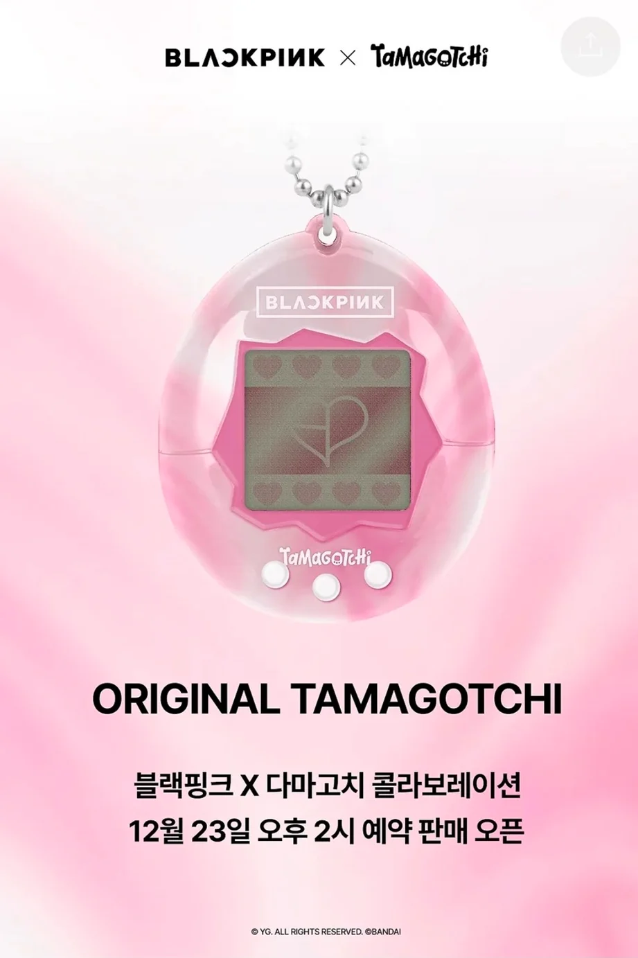 Cette collaboration sera disponible à partir du 23 décembre à 14h (KST) via le service KakaoTalk Gift, où l’agence a également partagé le lien d’achat officiel. Une prévisualisation du produit final est déjà accessible sur la boutique, dévoilant un Tamagotchi revisité aux couleurs et à l’univers emblématique de BLACKPINK.