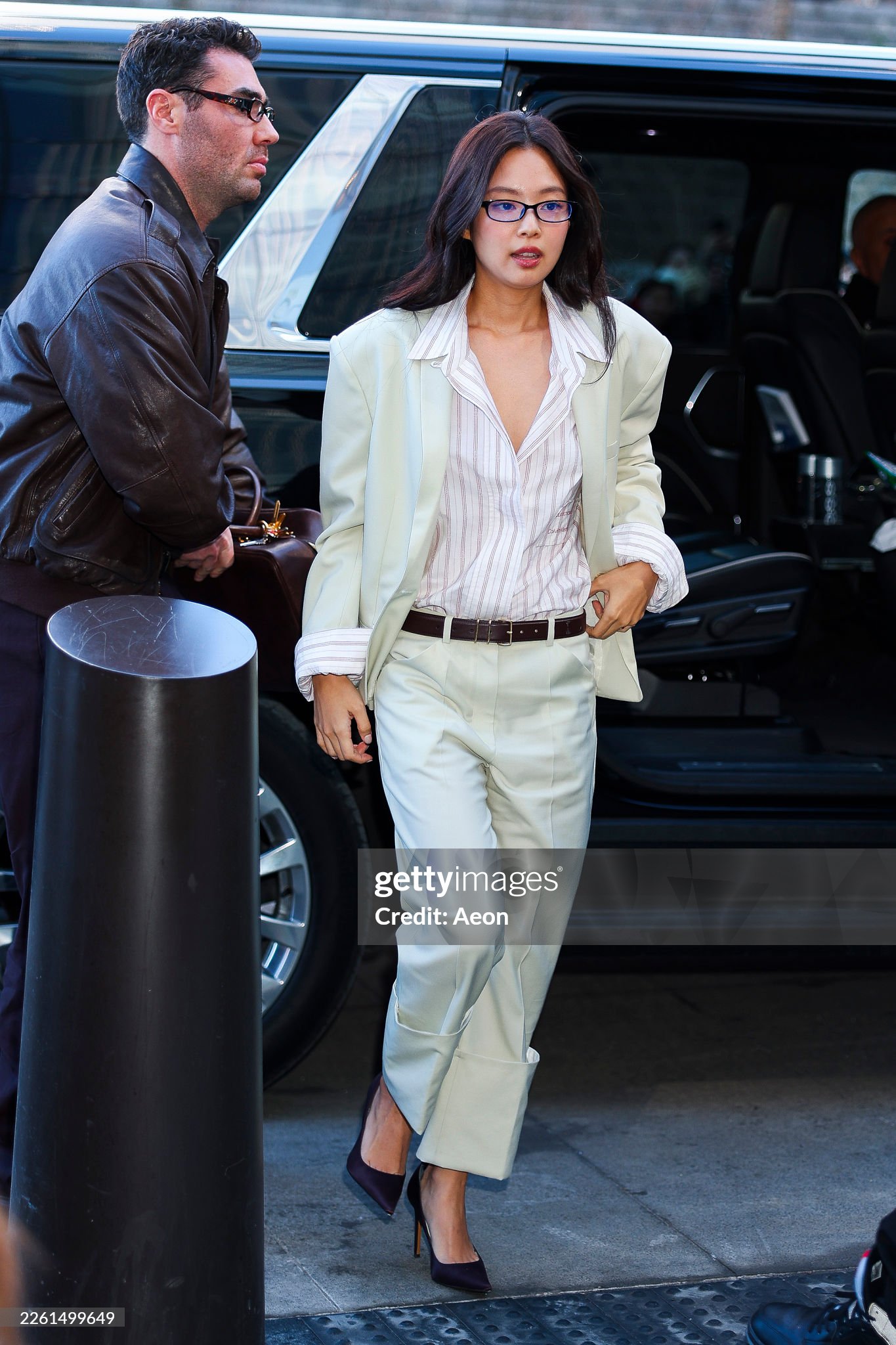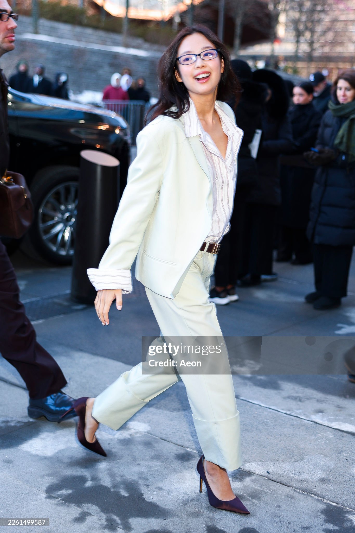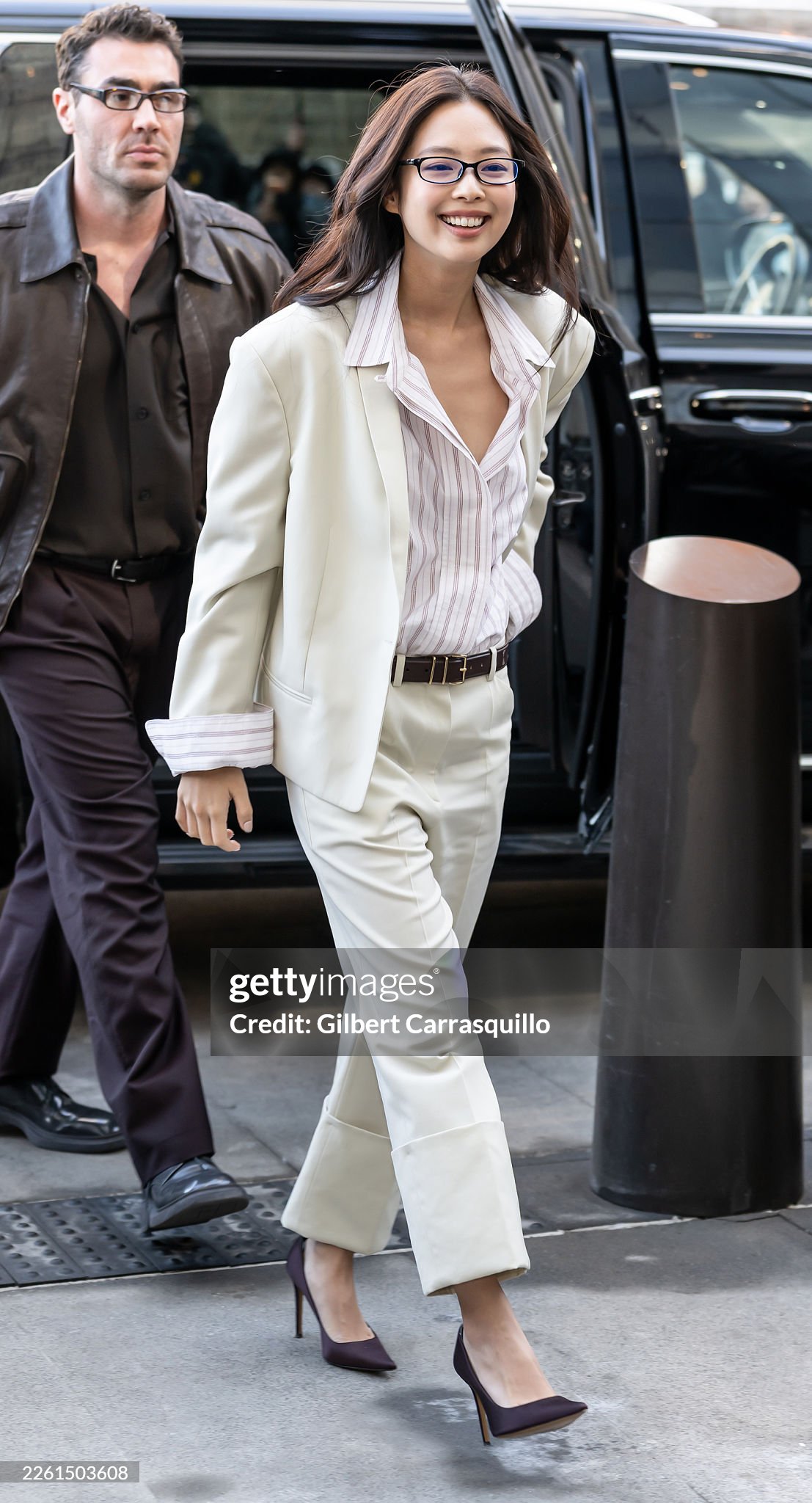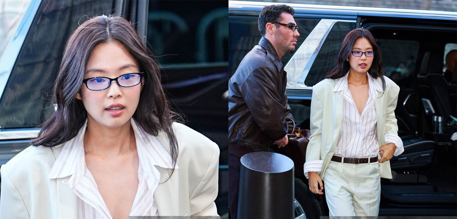 Vêtue d’un élégant tailleur ivoire associé à une chemise rayée et des lunettes, elle a immédiatement capté l’attention à son arrivée. Avec ses cheveux et son maquillage volontairement naturels, l’idol a mis en valeur une silhouette à la fois sobre, raffinée et parfaitement ajustée.
