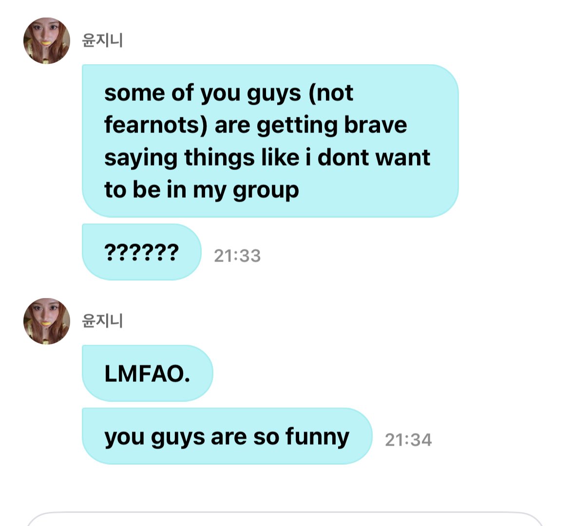 « Certains d’entre vous (pas les Fearnots) deviennent courageux en disant des choses, comme si je ne voulais pas être dans mon groupe. ????? LMAO. Vous êtes tellement drôles. »