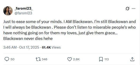 « Pour rassurer certaines personnes : je suis BLACKSWAN. Je suis toujours BLACKSWAN et je le resterai toujours. Ne faites pas attention à ces gens misérables qui n’ont rien d’autre à faire, mes amours, accordez-leur juste un peu de grâce… BLACKSWAN ne meurt jamais hehe. »