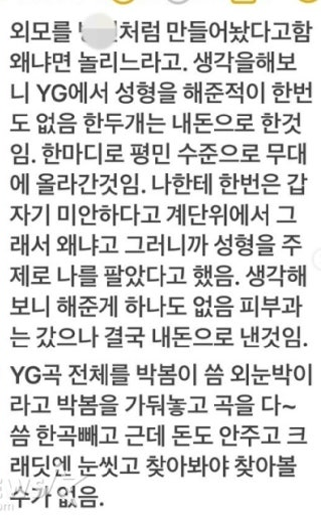 Dans ces notes, Park Bom règle une nouvelle fois ses comptes avec YG, affirmant :
