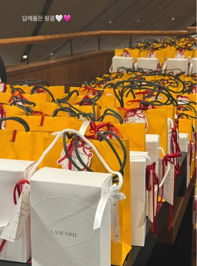Les cartes de menu se distinguaient par leurs illustrations dessinées à la main et leurs messages manuscrits, réalisés personnellement par le couple, apportant une touche particulièrement sincère. En guise de cadeaux de remerciement, les invités ont reçu des produits de Lancôme, marque dont Shin Min Ah est actuellement l’ambassadrice, ainsi que des articles de Acqua di Parma. Chaque présent était accompagné d’une carte portant le message :