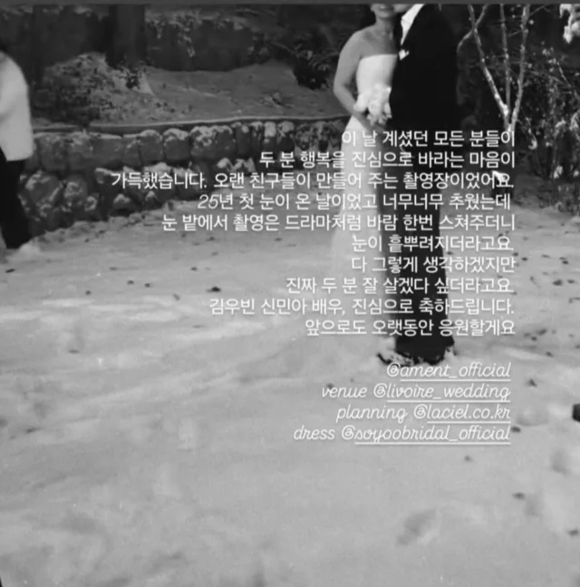 Le studio en charge des photos de mariage a également partagé des images des coulisses du shooting, précisant que les clichés avaient été réalisés dans un décor enneigé. Une vidéo montrant Kim Woo Bin et Shin Min Ah posant ensemble a été diffusée : bien que leurs visages n’y apparaissent pas clairement, les fans ont été ravis d’apercevoir le couple dans cette atmosphère romantique.