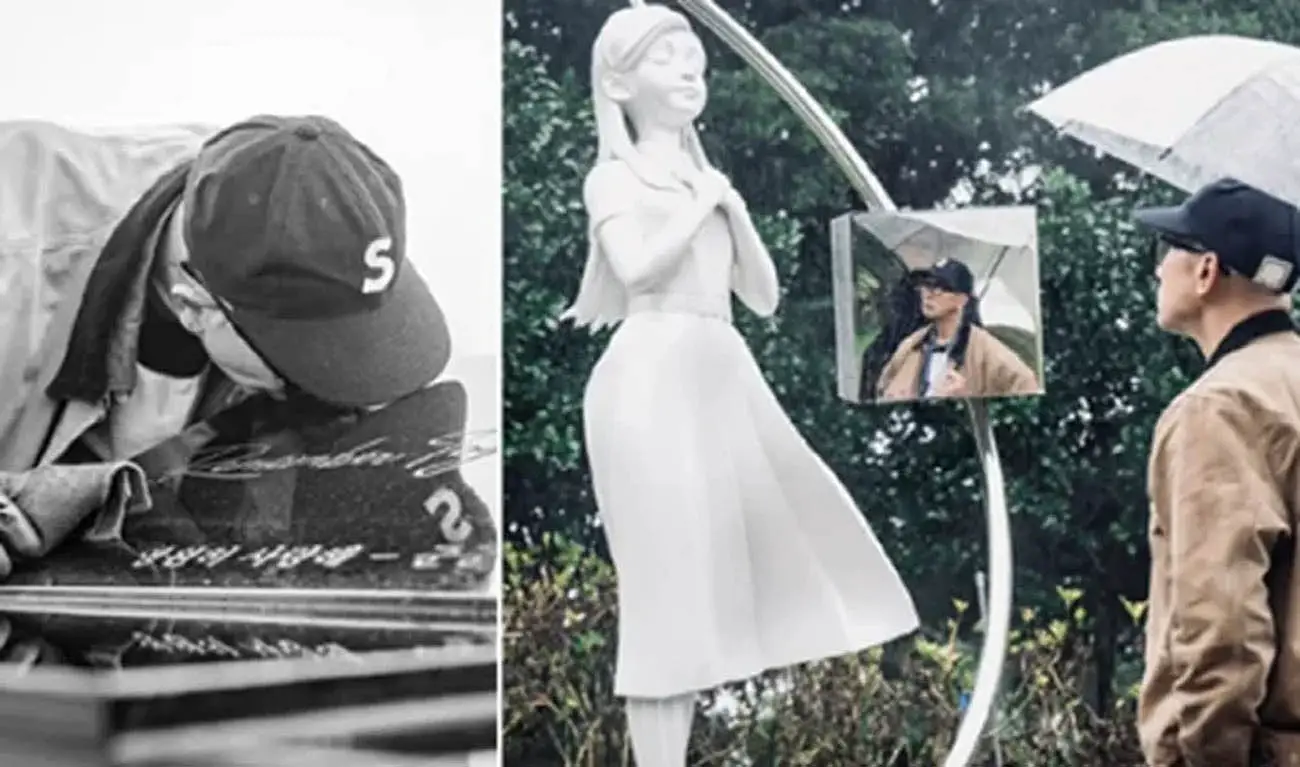 Parallèlement à la cérémonie, des photos ont été dévoilées, montrant Koo Jun Yup contemplant silencieusement la sculpture, le regard chargé de mélancolie. Une autre image le capture embrassant la pierre tombale de Barbie Hsu, gravée en coréen des mots : « Forever love you – Junjun ». D’autres clichés le montrent feuilletant de vieilles photographies de son épouse, rassemblées lors de la conception de l’œuvre, traduisant un deuil profond et un amour intact.