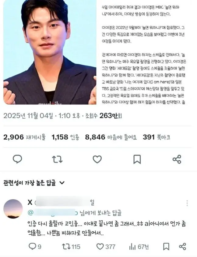 Plus tôt, Lee Yi Kyung avait fermement nié les rumeurs concernant sa vie privée, déclarant sur les réseaux sociaux qu’elles étaient « totalement fausses » et annonçant son intention d’engager des poursuites judiciaires. Son agence, Sangyoung ENT, avait confirmé le 3 novembre :