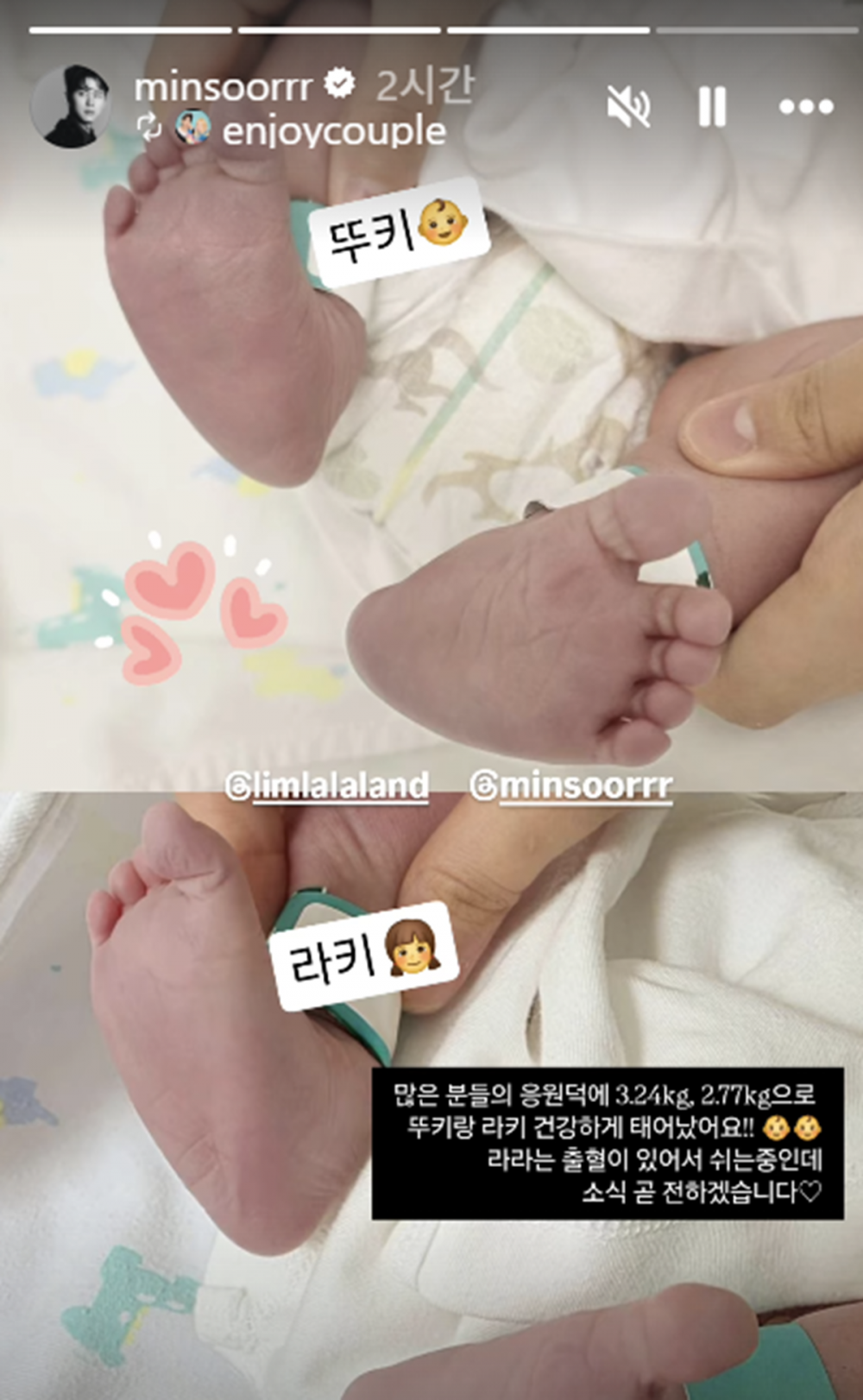 Le couple de comédiens et YouTubers Im La Ra et Son Min Soo, connu sous le nom de Enjoy Couple, vient d’accueillir ses premiers enfants !