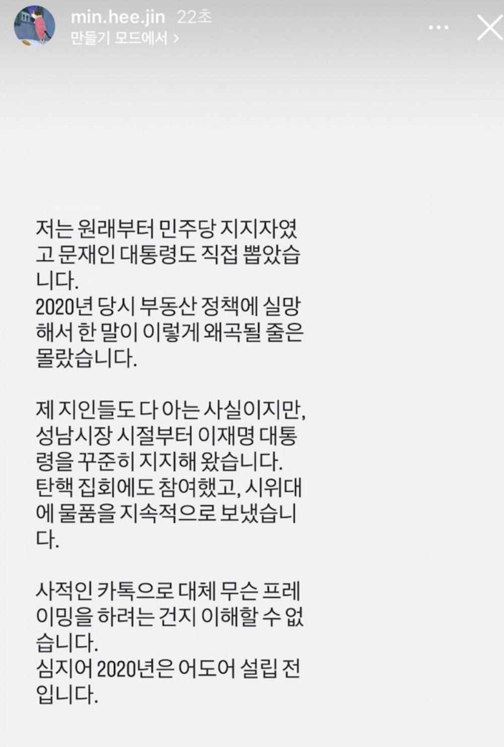 Elle a poursuivi : « J’ai toujours soutenu le Parti Démocrate et j’ai personnellement voté pour le président Moon Jae In. Je n’aurais jamais imaginé qu’une remarque privée faite en 2020, par déception vis-à-vis de la politique immobilière, serait déformée à ce point. Je soutiens Lee Jae Myung depuis ses années en tant que maire de Seongnam. J’ai même participé à des rassemblements pour sa destitution et envoyé des fournitures aux manifestants. Je ne comprends absolument pas quel cadre HYBE cherche à créer à partir de messages privés sur KakaoTalk. »