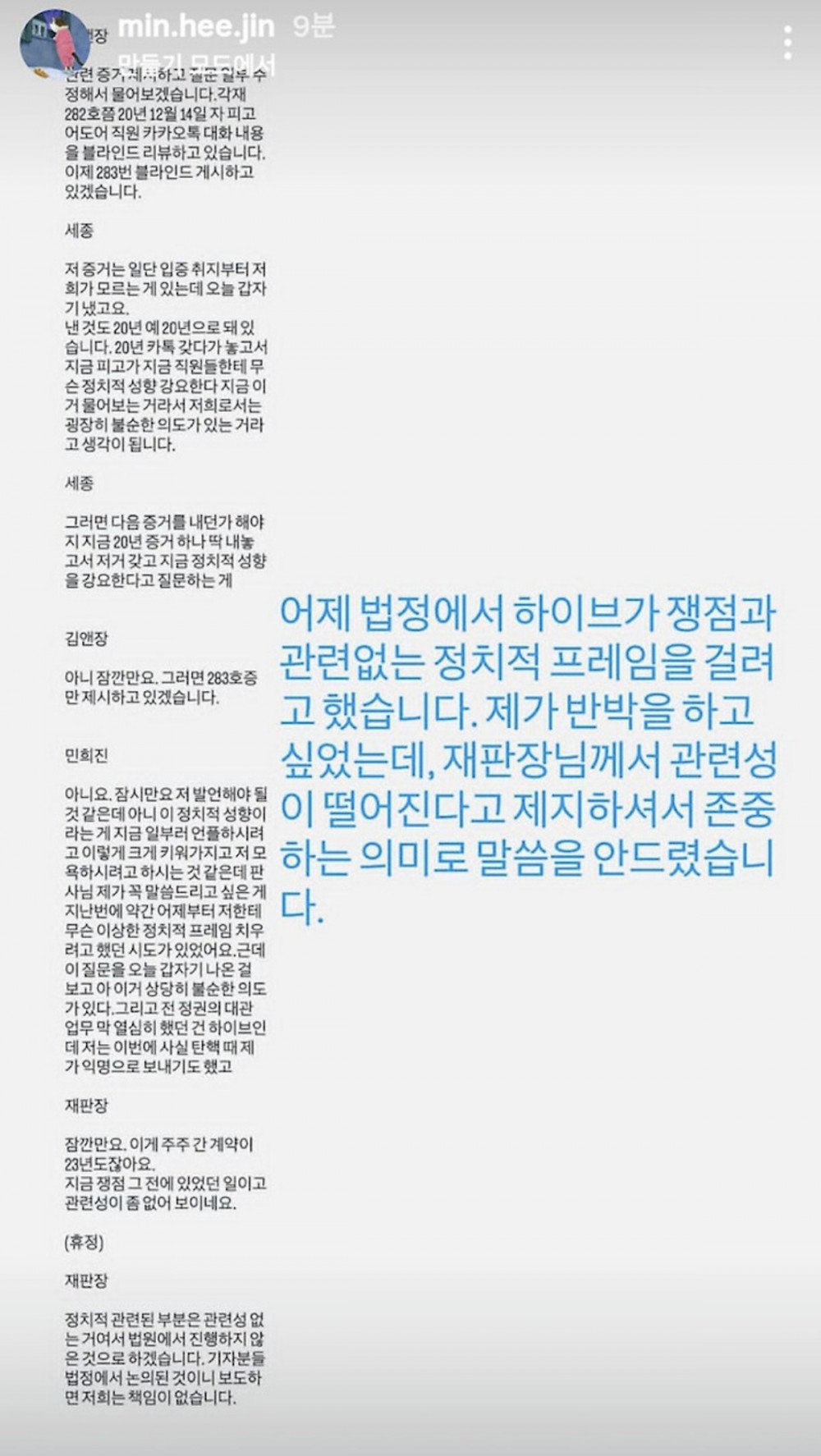 Durant l’audience, les représentants juridiques de HYBE ont cité une publication d’une communauté en ligne dédiée à la vie en entreprise, et soumis des messages KakaoTalk comme éléments de preuve. La publication affirmait que Min aurait dit à des employés « de ne pas voter pour le Parti Démocrate. » Parmi les messages présentés figuraient des remarques telles que : « Pourquoi avez-vous voté pour le Parti Démocrate ? », « S’il n’y a aucun parti valable, il ne faut pas voter. Comme moi », « Perdre son temps à faire la queue en pleine pandémie », ou encore « Vous savez seulement que voter est un droit mais vous n’étudiez pas », ce qui a déclenché une vive controverse.