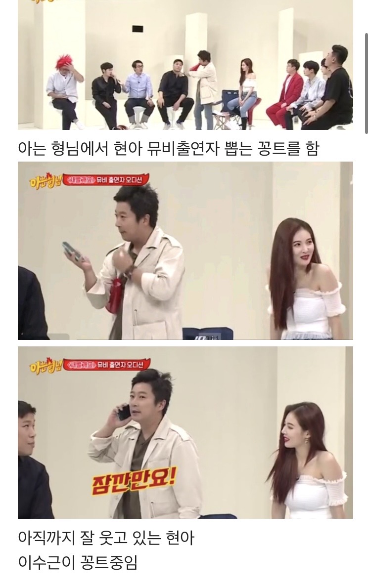 Dans cette séquence, les membres de l’émission participent à un sketch où ils doivent choisir qui apparaîtrait dans le clip de HyunA. Alors que Lee Soo Geun joue la comédie et que HyunA rit encore, visiblement à l’aise, Seo Jang Hoon lance soudainement :