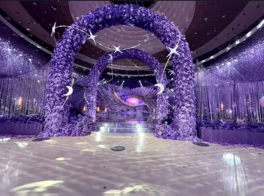 La cérémonie s’est tenue dans un lieu somptueux, décoré de fleurs suspendues et baigné de lumières violettes, donnant l’impression d’un véritable conte de fées.