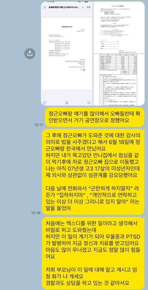 « J’ai longuement discuté avec Shun oppa, et après avoir gagné sa confiance, j’ai choisi ce lieu pour la représentation. Ensuite, Shun oppa m’a dit qu’il voulait me remercier en m’offrant un repas, donc je l’ai rencontré en Corée le 18 juin. Après avoir déjeuné à la maison de ma connaissance, nous sommes partis en voiture chez Junggeun oppa, et là, j’ai été forcée à faire quelque chose contre ma volonté. Il m’a obligée à avoir des relations sexuelles alors que je n’avais que 17 ans, je suis née en 2007. Le lendemain, il m’a appelée pour me dire : “Ne rends pas la situation compliquée”, “Ne sois pas obsédée”, “Puisqu’on est en contact personnel, ne reste pas dans le fandom.” Au début, j’ai gardé ça pour moi, pensant que c’était quelque chose que je devais supporter pour XD. Mais depuis, mon état mental s’est fortement dégradé. Je reçois un suivi médical, et mes parents sont au courant. »